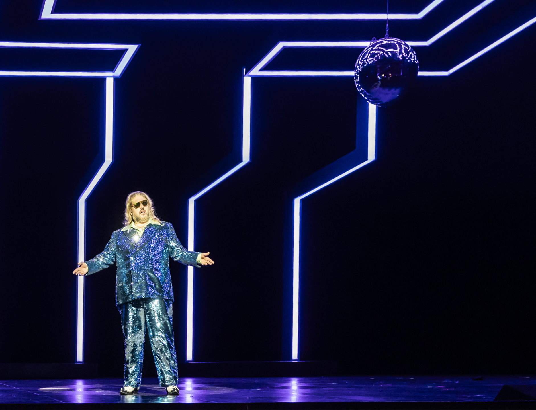 Das italienische Regieteam um Damiano Michieletto entschied sich fürs Metatheatrale — und stellt uns mit viel Paletten, Diskokugel und reichlich Bühnennebel den dritten Akt als Revuetheater auf dem Theater vor. Tanzende Cowboygirls und blaue Federhüte mit viel nacktem Bein sind auch wunderbar trashig und fürs Publikum wie auch für Falstaff, für den diese Glitzerwelt als erogener Köder inszeniert wird, ein visuell reizendes Spektakel. Auch der Clash mit dem Geisterchor beiger Perücken, gestützt auf allerlei Gehhilfen—wie aus der Altenverwahranstalt des Unbewußten entflohen—liefert ein bildgewaltiges Tableau, wie gemacht für die Fotoabteilung des Hausmarketings. Doch der Aufwand verpufft folgenlos, ohne tiefere Einsicht.