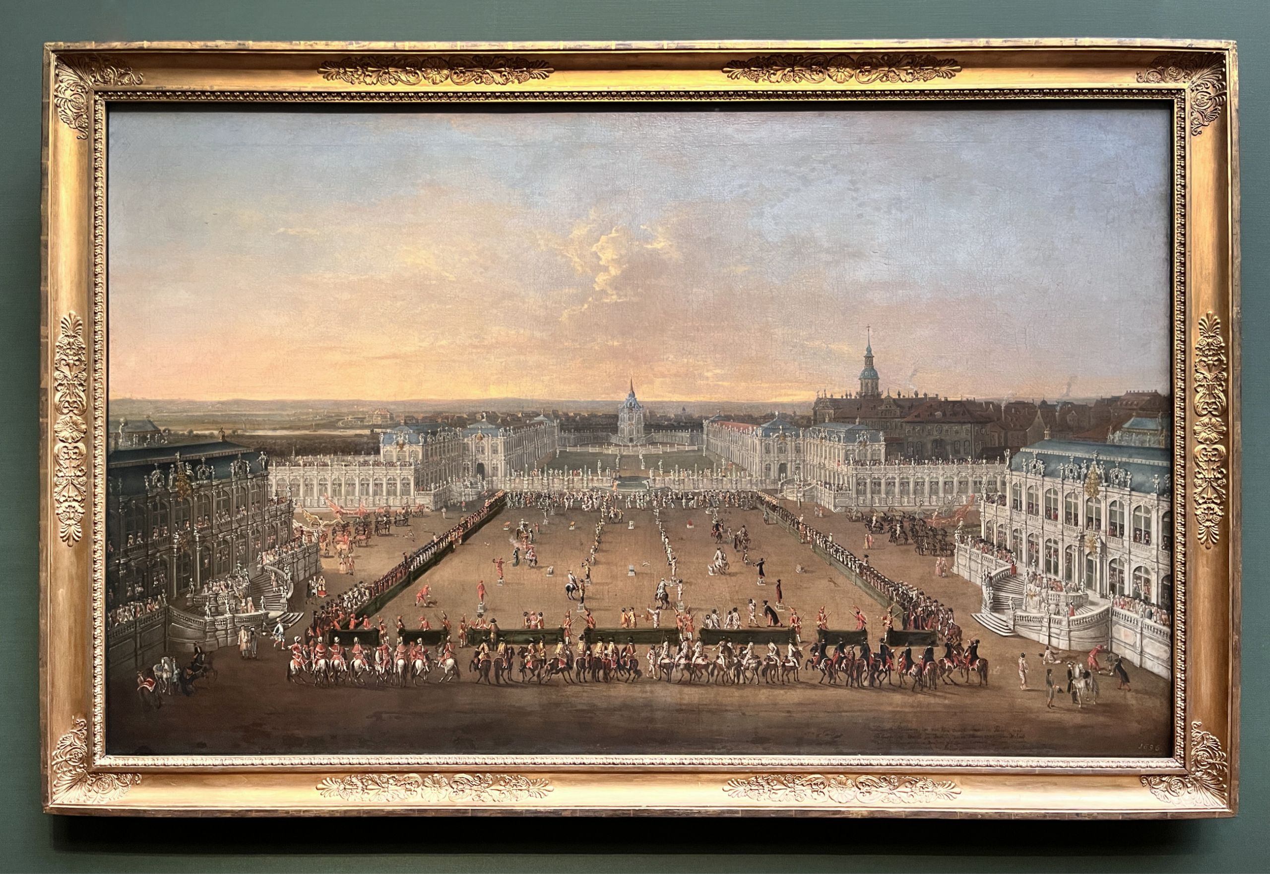 Es lohnt sich durchaus, nach den Wirrungen des 20. Jahrhunderts (dazu später) noch einmal in die Geschichte des elbvenezianischen Karnevals zu blicken. Ein perfekter Einstieg für mich war es da, mit dem Büchlein in der Hand einmal durch die Gemäldegalerie zu flanieren. Hier hängen die beiden berühmten Bilder »Caroussel Comique« und »Aufzug im Zwinger« des Malers Johann Alexander Thiele (1685-1752), und nicht weit von ihnen die Veduten Canalettos und Bernardo Bellottos, die eine seelische Verbindung zwischen Venedig und Dresden mit Leichtigkeit knüpfen lassen. Ein weiteres interessantes Werk, Caspar van Wittels »Piazzetta und Dogenpalast in Venedig«, zeigt das berühmte Bucintoro, die Staatsgaleere des Dogen, die August den Starken bei seiner Kavaliersreise bekanntlich dazu anregten, für seine Hochzeit eine eigene Prunkgondel bauen zu lassen.