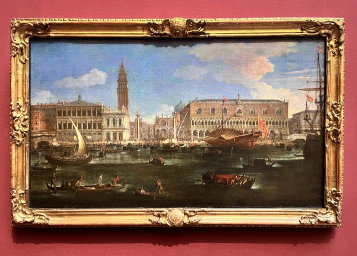 Durch den van Wittel wurde ich gleich an einen »Bucintoro« Canalettos erinnert, der sich heute im MNAC, im „Museu Nacional d’Art de Catalunya“ in Barcelona befindet. Auf diesem Bild entdeckt der aufmerksame Betrachter in der unteren linken Ecke mehrere geheimnisvolle Maskierte, die offenkundig dem venezianischen Karneval entsprungen sind. Dass diese malerische Inszenierungen mit dem Himmelfahrtstag (an dem der Doge mit dem Bucintoro auslief) datumstechnisch kaum übereinanderzubringen waren, wie Stephen Fry hier an einem ähnlichen Gemälde feststellte, soll uns nicht weiter bekümmern – alles ist Spaß auf Erden, wie wir Musikliebhaber wissen.
